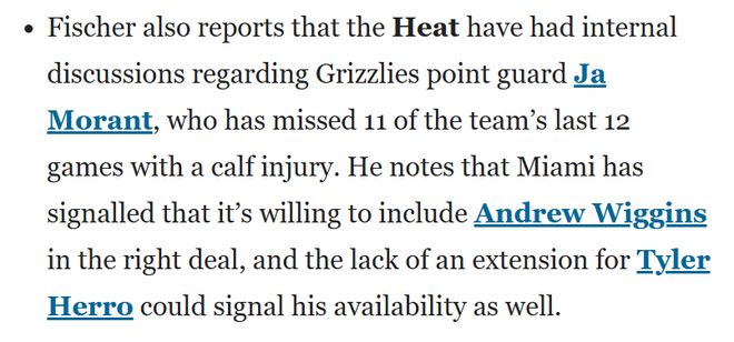除了是字母哥的潜在下家,Fischer爆料称,热火内部已就灰熊后卫莫兰特展开讨论,后者因小腿伤势已缺席球队近12场比赛中的11场。Fischer指出,热火方面已释放信号,愿意将维金斯纳入合适的交易方案,而希罗至今未完成续约这一情况,也可能意味着他已被球队列入可交易名单。